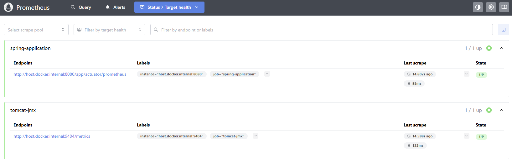 상단 메뉴에서 Status 클릭 후 드롭다운에서 Targets 선택하면 연결 상태를 확인할 수 있다.
