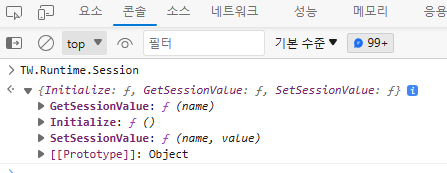 TW.Runtime.Session 객체는 브라우저 개발자 도구의 콘솔에서 아래 명령어를 입력해 살펴볼 수 있다.