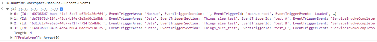TW.Runtime.Workspace.Mashups.Current.Events;테스트를 위해 만든 이 Mashup에서는 Mashup Load 이벤트와 서비스 호출 완료 시점에서 trigger되는 ServiceInvokeCompleted 이벤트가 설정되어있는데, 위의 코드를 실행시킨 조회 결과로도 확인이 가능하다.