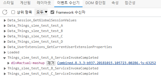 콘솔에서 조회하는 방법 이외에도 브라우저 개발자 도구에서 Mashup Element를 선택하여 이벤트 리스너 탭을 통해 이벤트를 조회할 수도 있다.