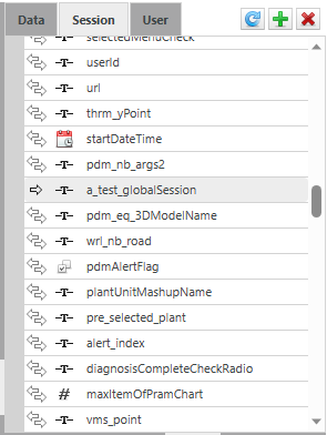 Thing Shape를 저장하면 이제 Mashup 에디터의 Session 탭에서 추가한 세션 속성을 확인할 수 있고, 이벤트와 값을 바인딩 할 수 있다.