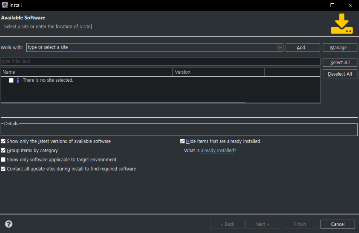 Eclipse 실행 후 Help > Install New Software...메뉴를 선택하여 설치 창을 띄운다.