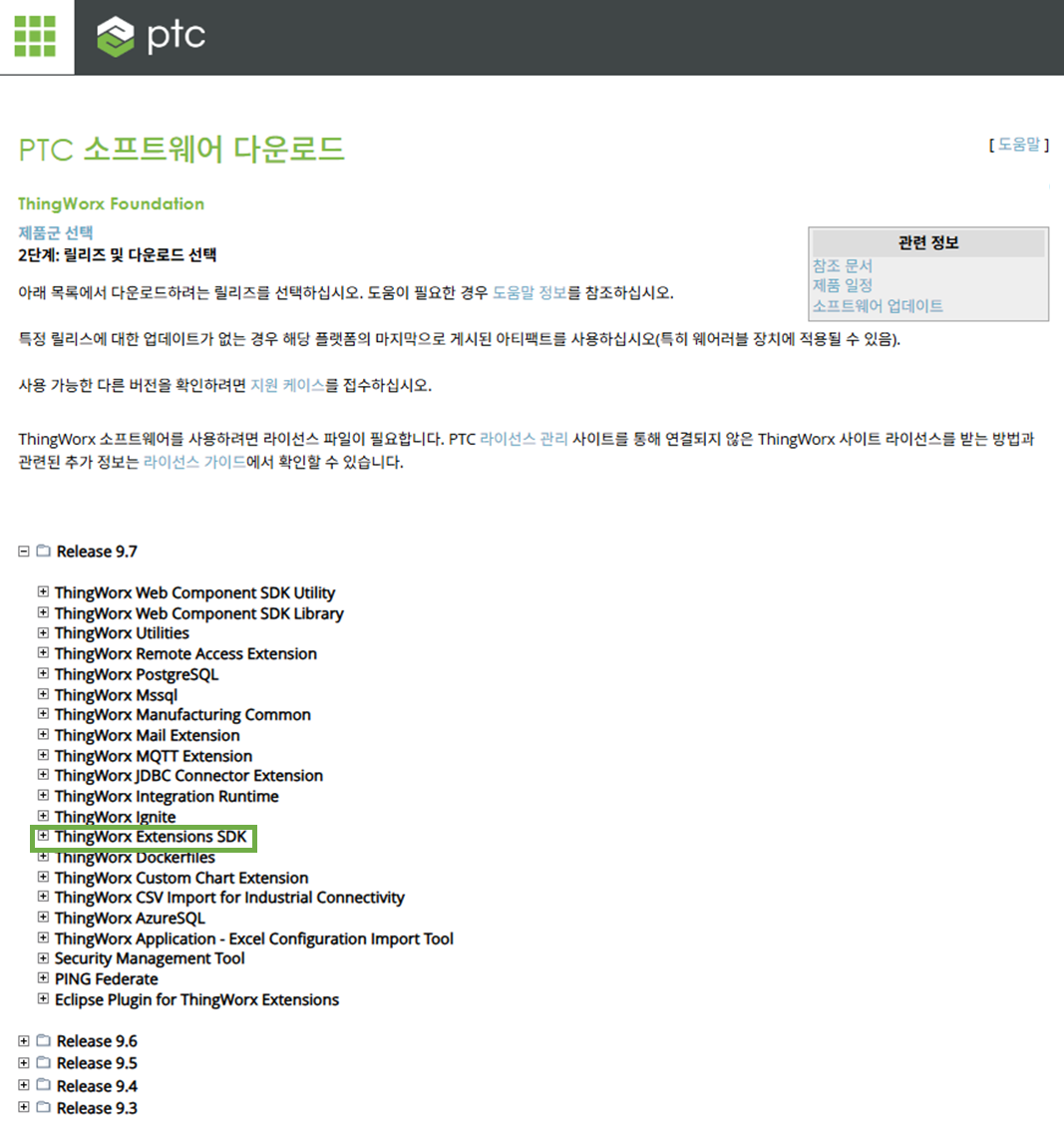 PTC Support에서 버전에 맞는 Thingworx Release그룹을 선택하여 Thingworx Extensions SDK zip 파일을 다운로드 받는다.