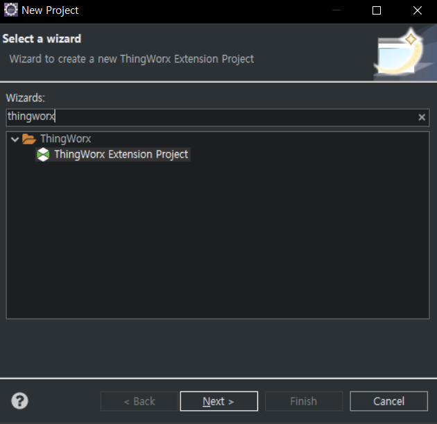 Thingworx를 검색하여 Thingworx 폴더를 확장하고 ThingWorx Extension Project를 선택한 후 Next를 클릭한다.