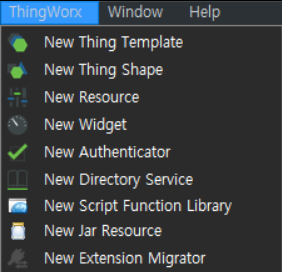 엔티티 생성을 위해서는 ThingWorx메뉴를 선택해 생성하고자 하는 엔티티 타입을 선택한다.
