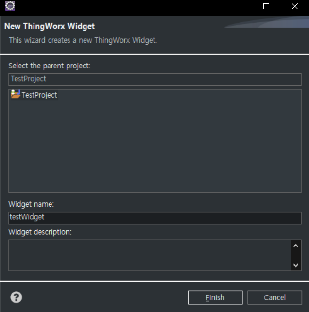 위젯 생성 창에서 새로운 위젯을 추가할 프로젝트를 선택 후 위젯 이름을 입력하여 Finish를 클릭해 위젯을 생성한다.