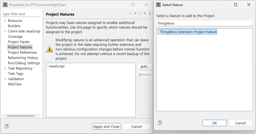 Directory...를 클릭하여 프로젝트 루트폴더를 선택하고Finish를 클릭한다. Project Explorer탭 상에서 프로젝트를 우클릭하여Properties창을 띄우고Project Nature을 메뉴에서Add...버튼을 클릭한다.- ThingWorx를 검색하여
