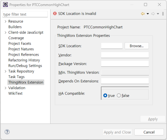 ThingWorx Extension메뉴로 진입하면, SDK Location is invalid 라고 되어있을 텐데Browse...를 클릭하여 SDK를 지정하고Package Version을 기입하여 환경 설정을 완료한다.