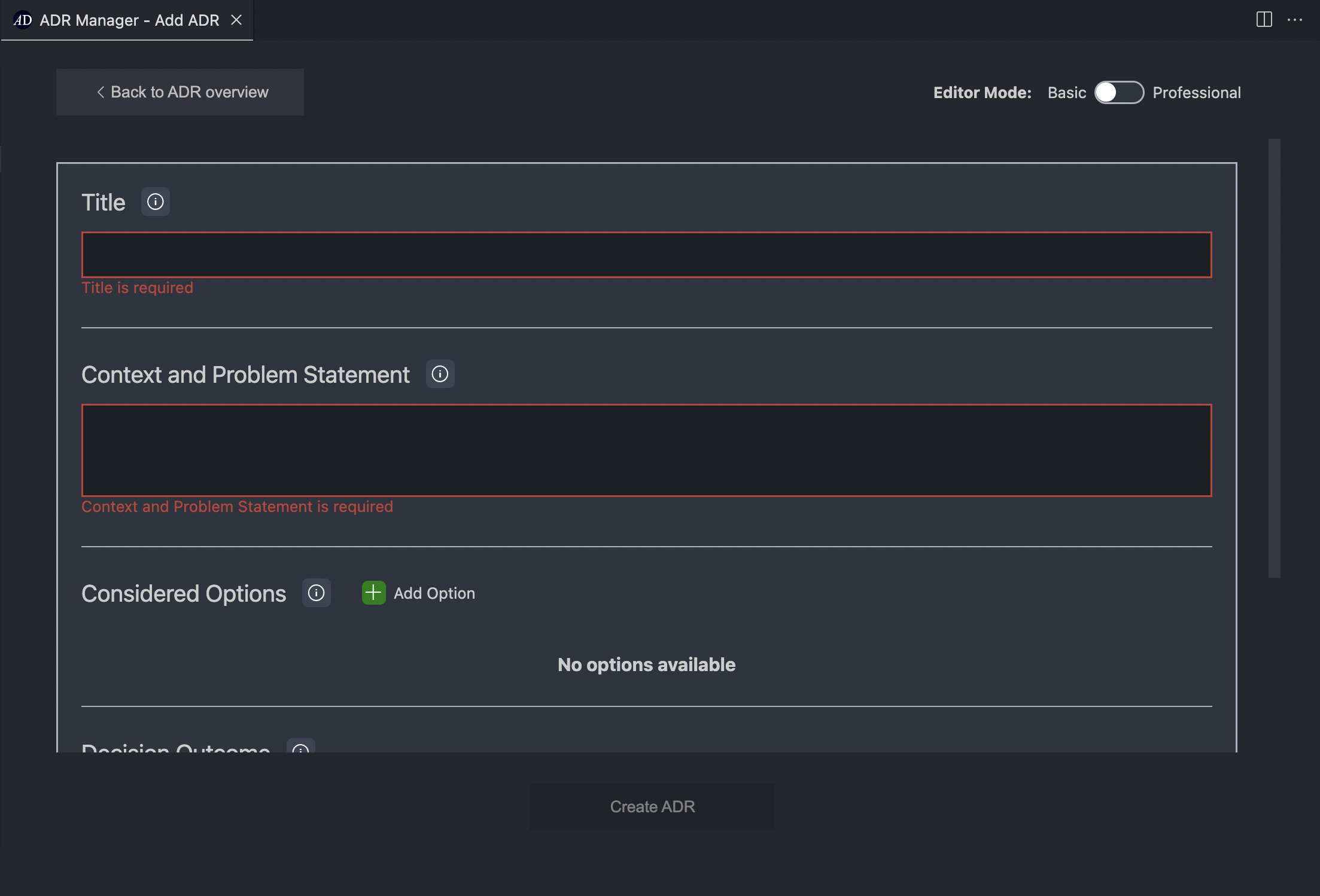 아래와 같이 각 ADR 구성 요소에 대해 입력 폼을 지원해주는 듯 하다.