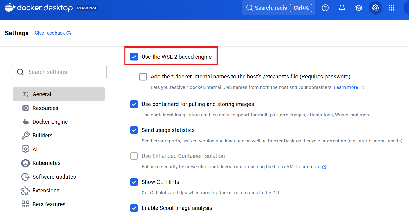 Use the WSL 2 based engine 체크박스가 선택되어있는지 확인한다.